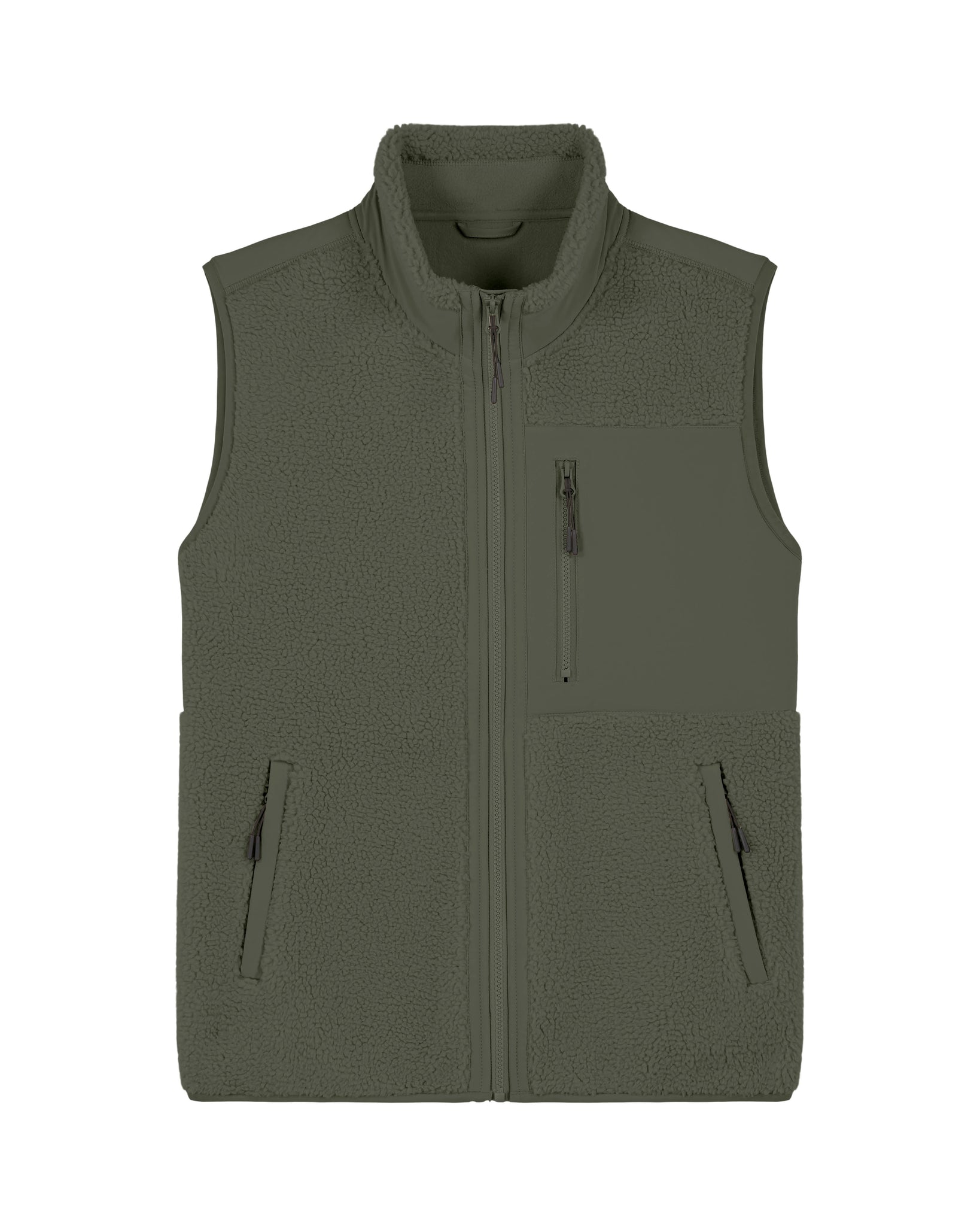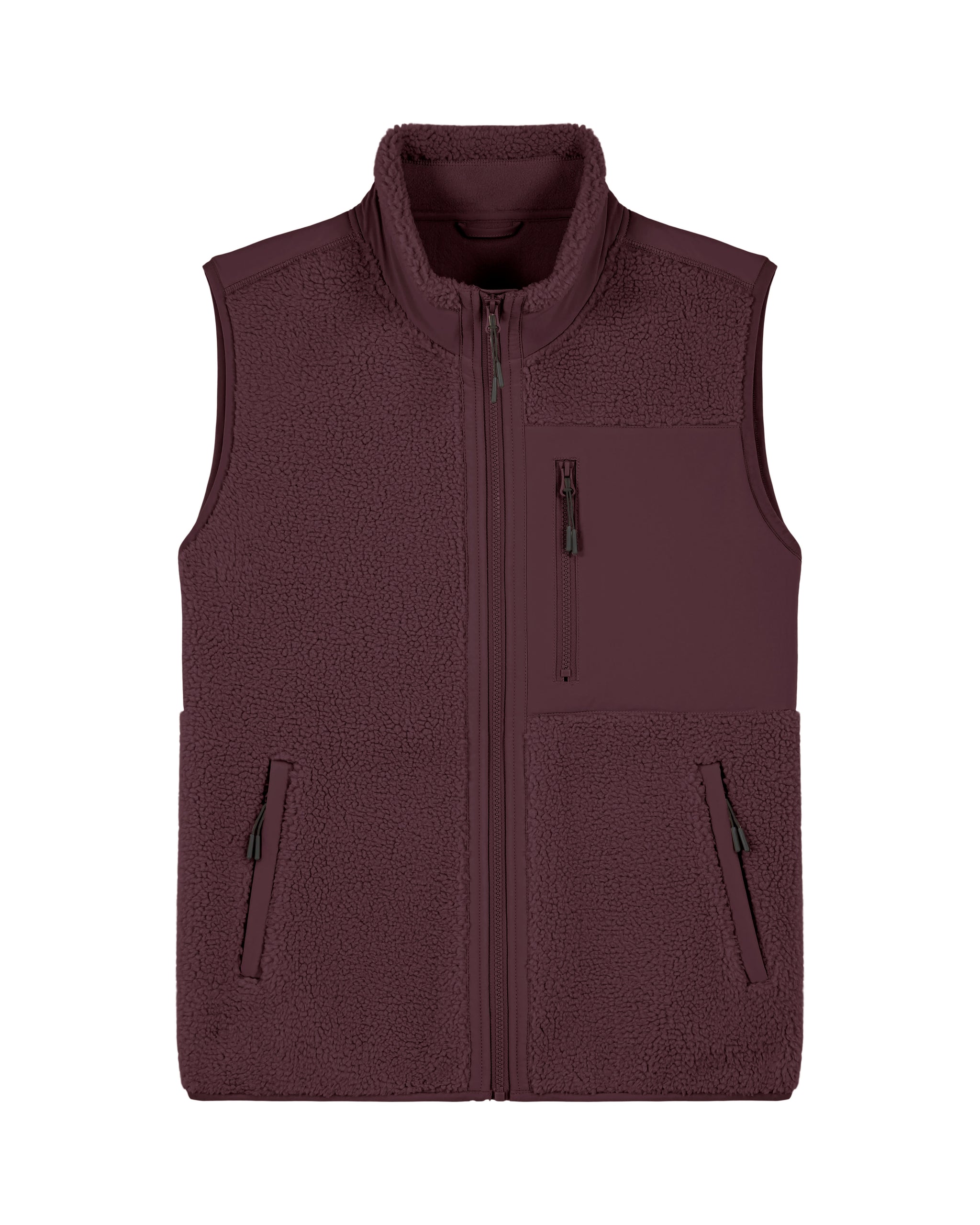- Unisex ärmellose Sherpa-Jacke aus 100 % recyceltem Polyester für nachhaltige Wärme und Stil.