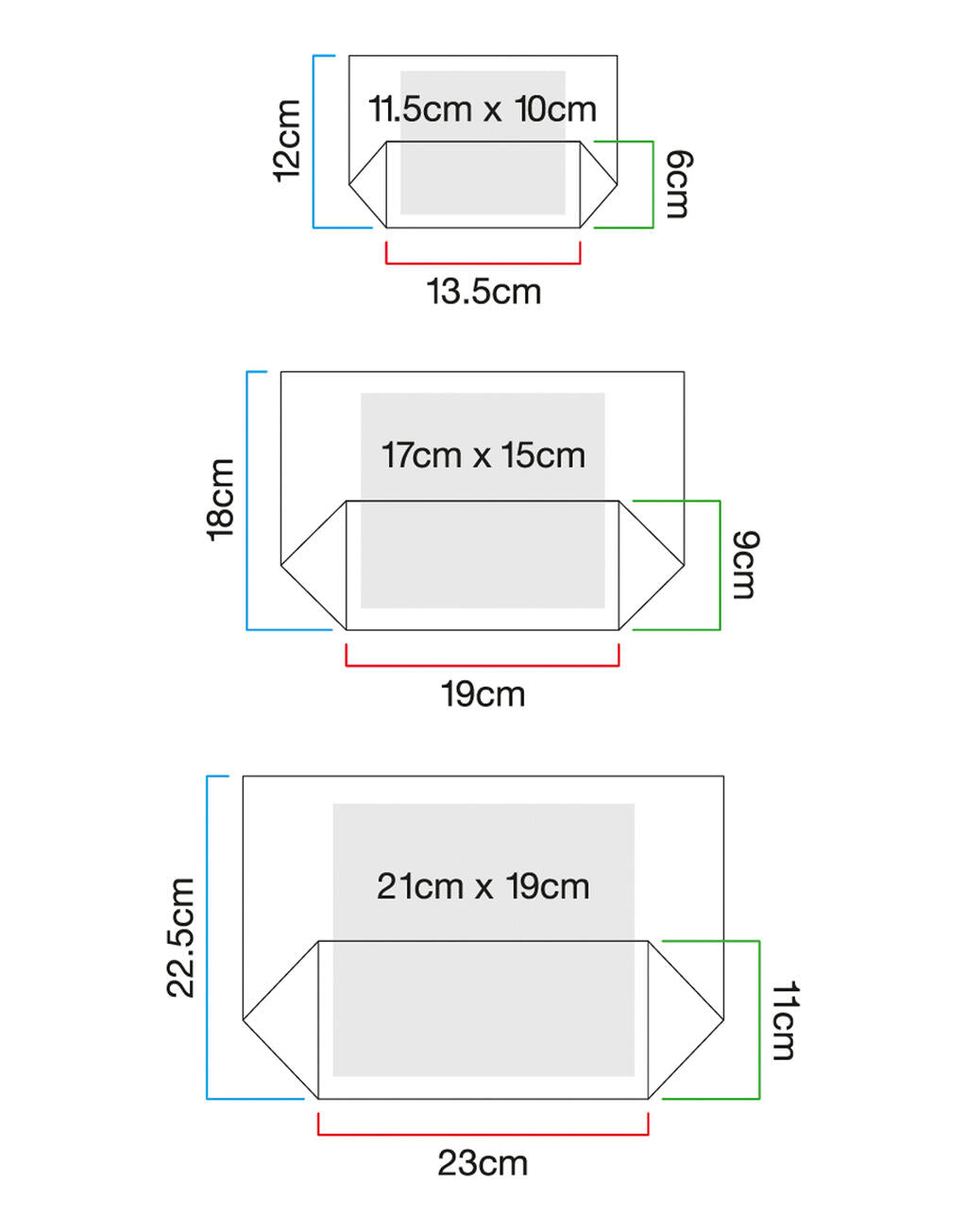 ·Max. Druckbereich in cm: 13.5 x 12 x 6 (S), 19 x 18 x 9 (M), 23 x 22.5 x 11 (L).